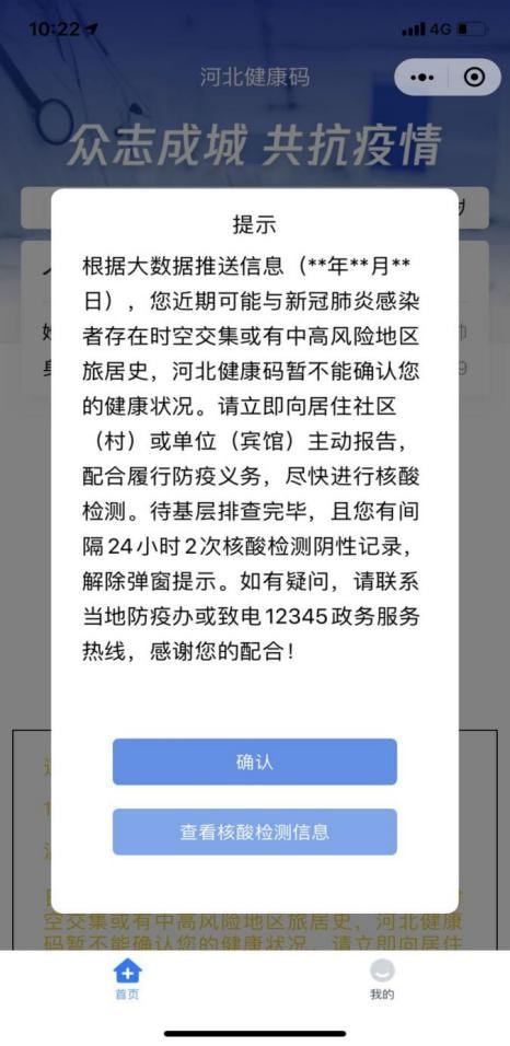 弹窗提示的内容为:根据大数据推送信息(**年**月**日),您近期可能与新冠肺炎感染者存在时空交集或有中高风险地区旅居史,河北健康码暂不能确认您的健康状况。请立即向居住社区(村)或单位(宾馆)主动报告,配合履行防疫义务,尽快进行核酸检测。待基层排查完毕,且您有规定的检测阴性记录,解除弹窗提示。如有疑问,请联系当地防疫办或致电12345政务服务热线,感谢您的配合!