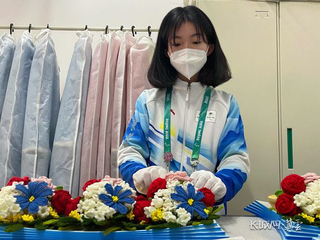 志愿者张鲡沣整理花束。来自河北师范大学的大三学生张鲡沣是张家口颁奖广场物资奖牌主管助理,主要负责奖牌、花束等颁奖物资的管理工作,也是近距离接触奖牌最多的志愿者。