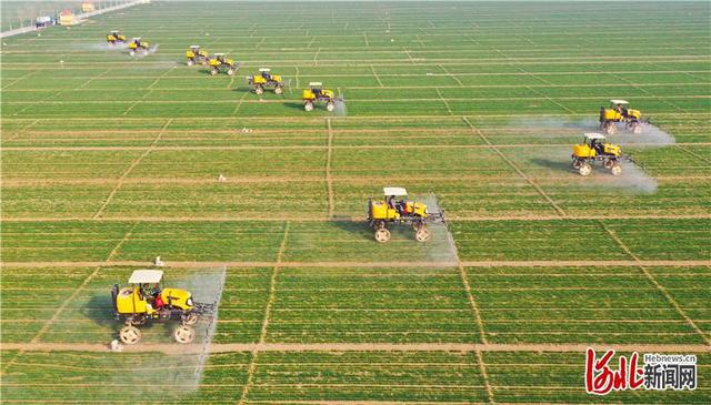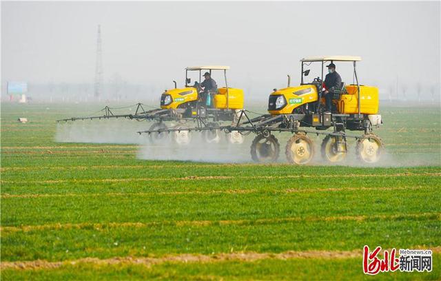 3月10日,在石家庄市藁城区梅花镇梅花村麦田里,藁城区丰可得农机种植专业合作社的社员驾驶自走式喷雾机进行一喷综防作业。进入春耕时节,河北省各地农民们正抢抓农时进行田间管护,积极开展春耕生产。河北日报记者 史晟全摄
