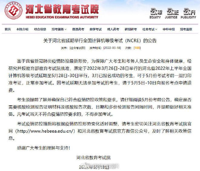 3月18日,河北省教育考试院发布关于河北省延期举行全国计算机等级考试(NCRE)的公告,鉴于河北省新冠肺炎疫情防控最新形势,为保障广大考生和考务人员生命安全和身体健康,经研究并报教育部教育考试院批准,原定于2022年3月26日-28日举行的河北省2022年上半年全国计算机等级考试延期至5月28日-30日举行。3月已报名成功的考生,可于5月份考试考前一周打印准考证,正常参加考试。因考试延期无法参加考试的考生,请于5月5日-10日向报名考点申请退费。