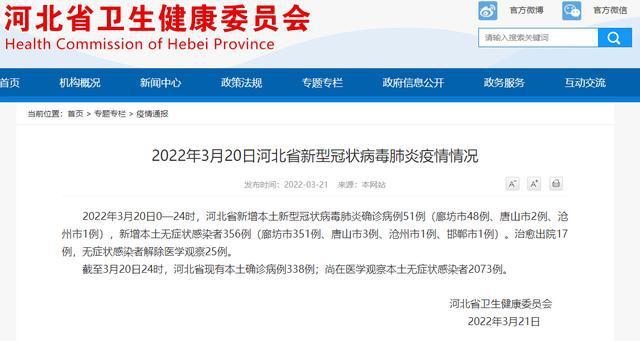 2022年3月20日0—24时,河北省新增本土新型冠状病毒肺炎确诊病例51例(廊坊市48例、唐山市2例、沧州市1例),新增本土无症状感染者356例(廊坊市351例、唐山市3例、沧州市1例、邯郸市1例)。治愈出院17例,无症状感染者解除医学观察25例。