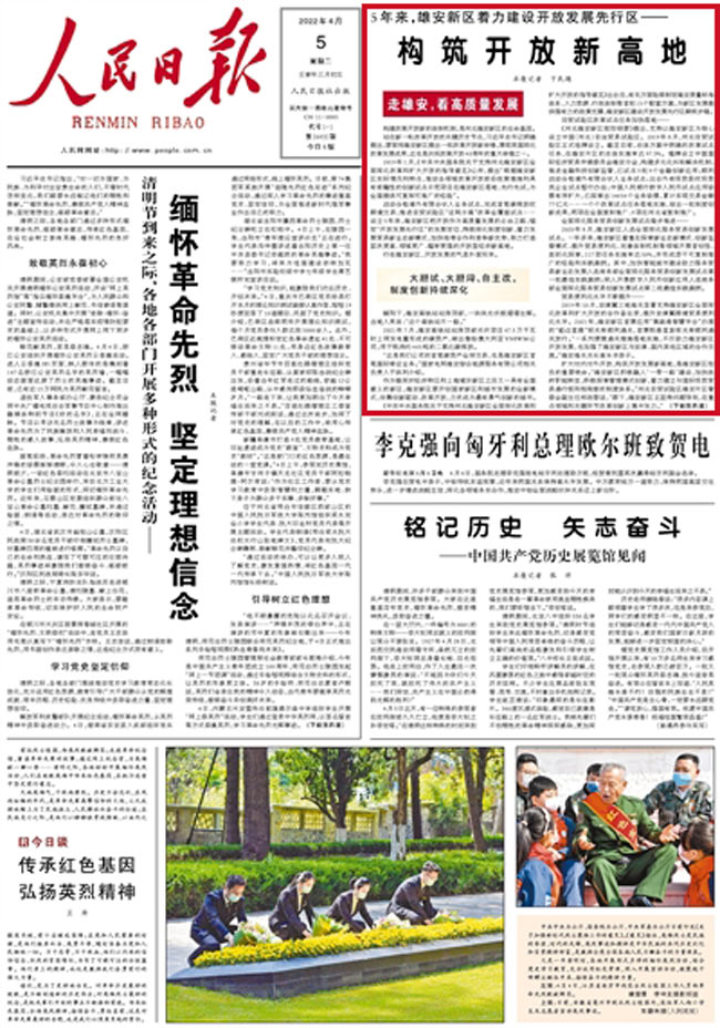 启动合格境外有限合伙人业务试点,完成首笔碳排放权跨境交易,推进自贸试验区“证照分离”改革全覆盖试点……设立5年来,雄安新区把开放作为高质量发展的必由之路,锚定“开放发展先行区”的发展定位,持续深化制度创新,着力发展贸易新业态新模式,加快培育合作和竞争新优势,努力打造层次更高、领域更广、辐射更强的开放型经济新高地。