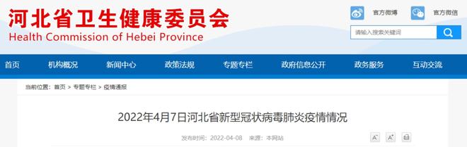 2022年4月7日0—24时,河北省新增本土新型冠状病毒肺炎确诊病例1例,为邯郸市报告;新增本土无症状感染者162例,其中保定市90例、邯郸市68例、石家庄市3例(外地返回人员)、邢台市1例。治愈出院17例,无症状感染者解除医学观察278例。
