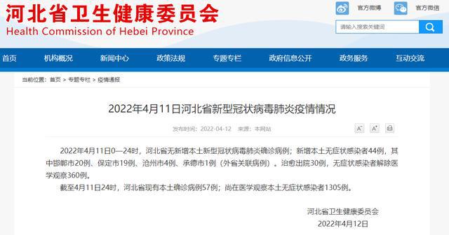 2022年4月11日0—24时,河北省无新增本土新型冠状病毒肺炎确诊病例;新增本土无症状感染者44例,其中邯郸市20例、保定市19例、沧州市4例、承德市1例(外省关联病例)。治愈出院30例,无症状感染者解除医学观察360例。