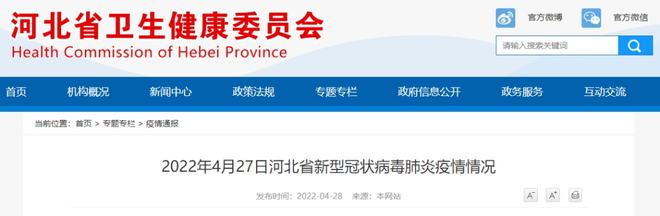 2022年4月27日0—24时,河北省新增本土新型冠状病毒肺炎确诊病例2例,为保定市报告;新增本土无症状感染者9例,其中保定市4例、唐山市3例、廊坊市1例(外地通勤人员)、秦皇岛市1例(外省返回人员)。治愈出院1例,无症状感染者解除医学观察82例。