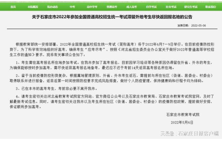 4.请考生密切关注河北省教育考试院官方网站、官方微信公众号以及石家庄市教育局、石家庄市教育考试院官网,及时了解最新考试信息。同时,请考生密切关注我市以及考生所在社区(街道、居委会、村委会)的疫情防控政策,提前做好安排,保证顺利参加高考。