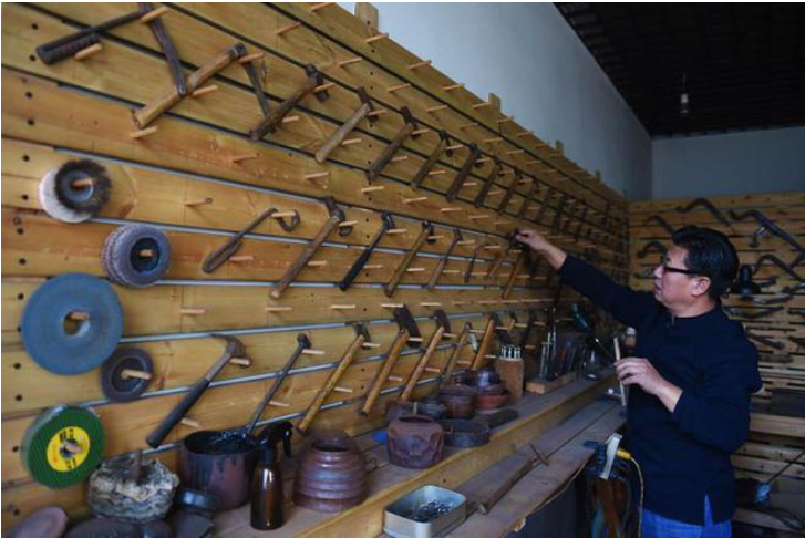 近日,河北省正定县传统金工冷锻造技艺代表性传承人王建辉在整理自己的作品。2021年河北省石家庄市文创和旅游商品大赛上,王建辉的作品获得金奖。