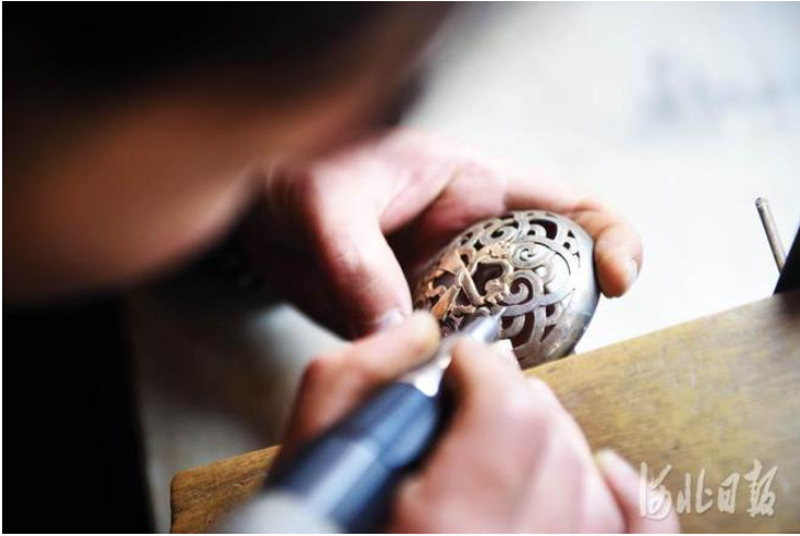 传统金工冷锻造技艺代表性传承人王建辉在雕刻冷锻作品。河北日报记者赵永辉摄影报道