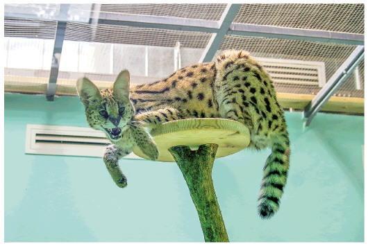 记者在北京市大兴区的北京野生动物园救护站里看到,一只躯干纤细、四肢修长的薮猫,时而趴在专门为其搭置的梯架上休息,时而站起来伸伸懒腰或者下到地面散步。
