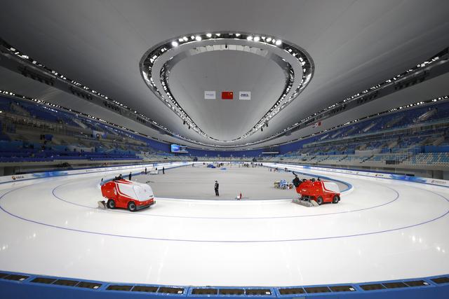 10月8日,国家速滑馆内,工作人员在赛前进行浇冰。图/IC photo