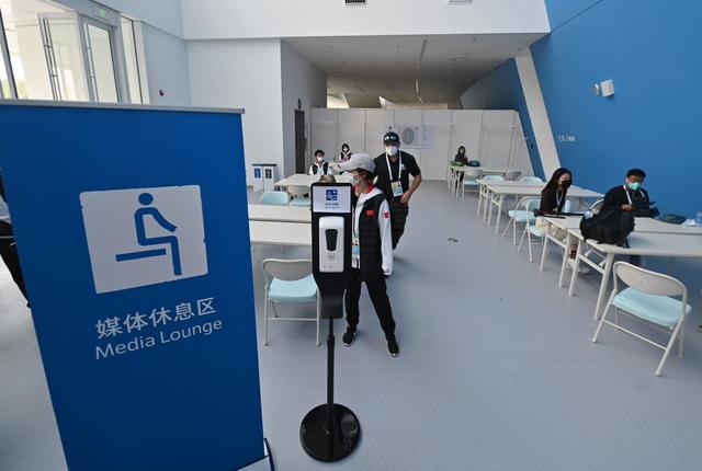 国家速滑馆内设置的媒体工作和休息区。新京报记者 陶冉 摄