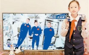 河西区平山道小学赵紫涵同学观看直播同时展示自己的作品。(平山道小学供图)昨天下午,“天宫课堂”第二课开课,神舟十三号乘组航天员翟志刚、王亚平、叶光富在中国空间站为广大青少年学生带来了一场精彩的太空科普课。本市中小学学生纷纷收看直播,直观感受到航天事业快速发展的伟大成就,极大增强了青少年学生的民族自