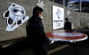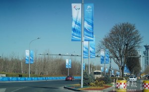 2月23日,工作人员在冬残奥村西门更换标志,门前的道路两侧道旗已经更换为冬残奥会道旗。