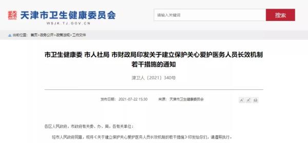 7月22日,天津市卫健委网站发布了天津市卫生健康委、天津市人社局、天津市财政局《关于建立保护关心爱护医务人员长效机制若干措施》的通知。