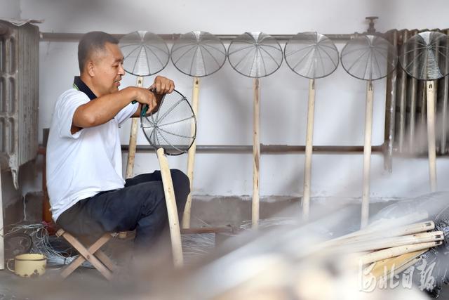 2021年9月7日,在石家庄市深泽县北刘家庄村的手工笊篱作坊里,当地手艺人正在手工编制笊篱。
