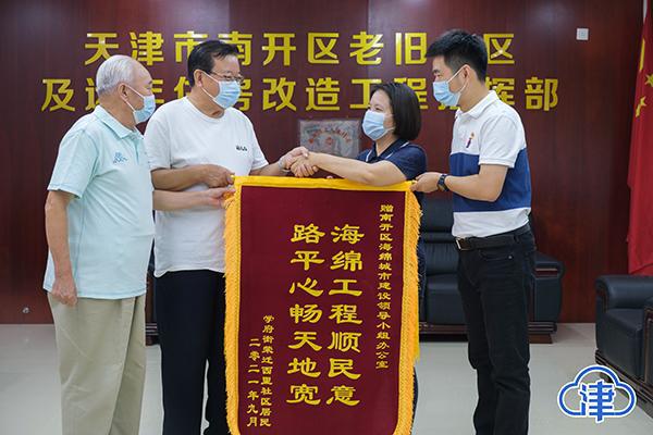 不久前,家住南开区学府街荣迁西里社区的老党员王春英、刘宝玓等人代表居民群众将一面写有“海绵工程顺民意,路平心畅天地宽”的锦旗送到区海绵城市建设领导小组办公室,畅谈海绵工程实施后为大家带来的便利,欣喜之情溢于言表。