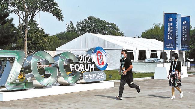 2021中关村论坛将于今晚在京开幕,主会场鲜花环绕,布置就绪。(阎彤 摄)