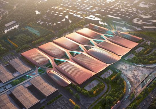 项目总体布局延续一期的中轴模式,在中轴线上设置了南、北登录厅、展览序厅以及连接会议酒店和新国展一期的景观连廊。项目建筑设计精巧,造型借鉴故宫博物院琉璃瓦的经典中国元素,将精致复杂的传统元素完美地融入建筑的纹理组织之中,彰显首都气质。优雅绵密的线条交织于各个展厅之间,寓意着信息时代知识的链接与共享。