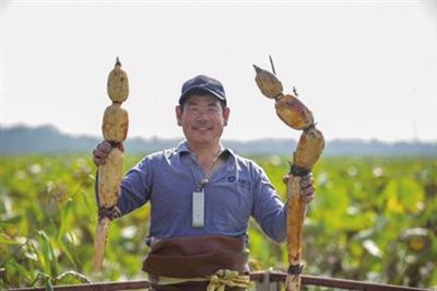 “今年,我们一亩地能出个四千斤藕。”丁所山擦了擦不小心粘到脸上的泥巴,笑着对我们说。“去年我们有800多亩地,今年又多承保了300亩,现在总共有1000多亩了。”丁所山师傅是江源夫妇承包的莲藕种植示范基地专门聘用的拥有30多年莲藕种植经验的技术工人。