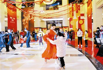 天津大礼堂前厅成为音乐会的第二现场,演员们邀请市民跳舞,伴随美妙的音乐和舞步共同跨进新一年。