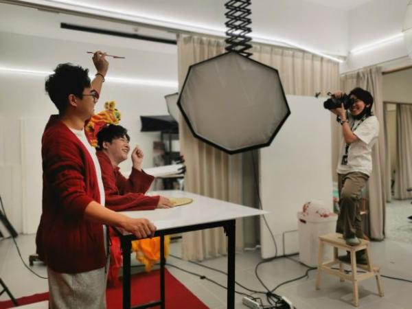 “左边的小哥哥脚尖点起,右边的小哥哥笑大一些,好,不错,三、二、一……”记者走进照相馆,看到摄影师芥末正在给哥俩儿拍照。两位年轻的小伙子身着同一款式红色上衣,一人举着红狮子,一个拿着黄狮子。在摄影师的指导下,他俩又举起一副对联:新的一年虎虎生威,又长一岁工资翻倍……拍摄照片的过程中,两位小哥哥不管是不是在配合摄影师的要求,都笑得合不拢嘴。