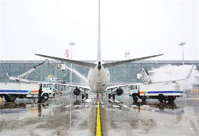 近日,全国多地迎来降雪天气。图为江苏常州国际机场的工作人员在为飞机除雪