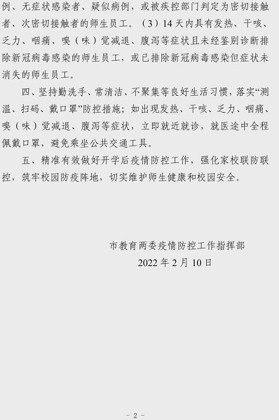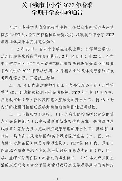 “津门教育”微信公众号发布关于我市中小学2022年春季学期开学安排的通告,全文如下: