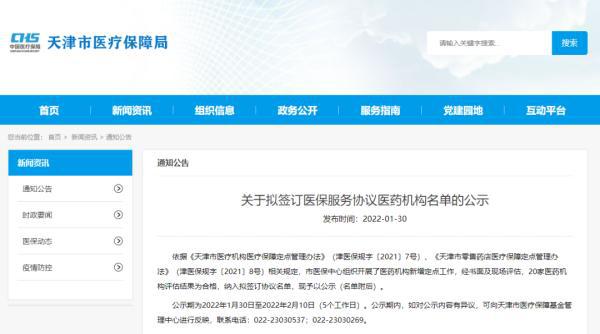 近日,天津市医保局发布《关于拟签订医保服务协议医药机构名单的公示》,市医保中心组织开展了医药机构新增定点工作,经书面及现场评估,20家医药机构评估结果为合格,纳入拟签订协议名单,涉及药房、医院、门诊等。