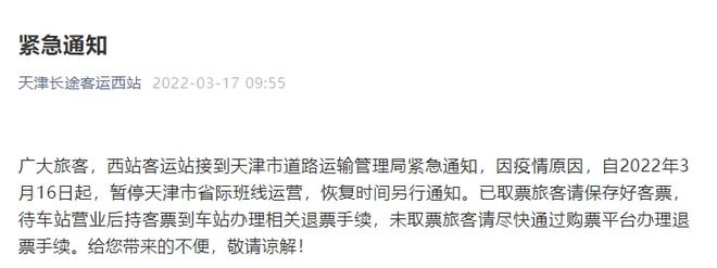 今天上午,天津长途客运西站发布紧急通知,因疫情原因,自2022年3月16日起,暂停天津市省际班线运营,恢复时间另行通知。已取票旅客请保存好客票,待车站营业后持客票到车站办理相关退票手续,未取票旅客请尽快通过购票平台办理退票手续。