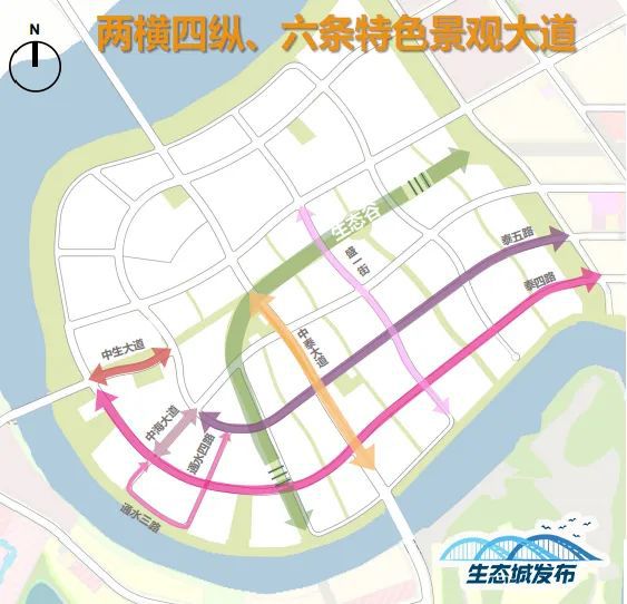6条景观大道包括海棠大道,位于中生大道(泰四路至泰五路);香花槐大道,位于中海大道(泰四路至泰五路);金栾大道,位于中泰大道(生态谷至泰四路);缤纷大道,位于盛一街(中滨大道至通水六路);樱花大道,位于泰四路(中生大道至盛三街);彩叶大道,位于泰五路(中海大道至盛三街)。