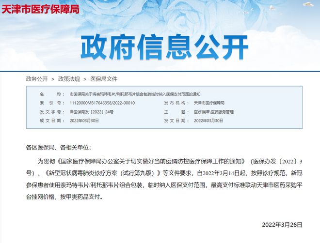 近日,天津市医疗保障局发布通知,自2022年3月14日起,新冠参保患者使用奈玛特韦片/利托那韦片组合包装,临时纳入医保支付范围,最高支付标准联动天津市医药采购平台挂网价格,按甲类药品支付。