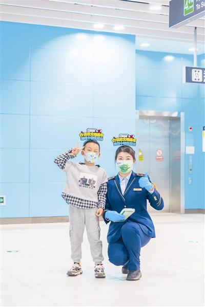 4号线“亲情服务台”旁设置有“繁华4锦 绿色出行”宣传展架,通过漫画的形式,宣传疫情防护、文明乘车的小知识。工作人员佩戴“请您文明乘车”发夹,活泼新颖的提示方式吸引了很多小朋友。与此同时,定制的“微笑服务”口罩,让佩戴者可以时刻保持微笑服务,绿色清新的设计,也象征着低碳、文明出行。发夹和口罩同时在现场发放,在为乘客提供防疫用品的同时,也让乘客更加了解首末班车时间、文明公约和防疫公约等运营信息。