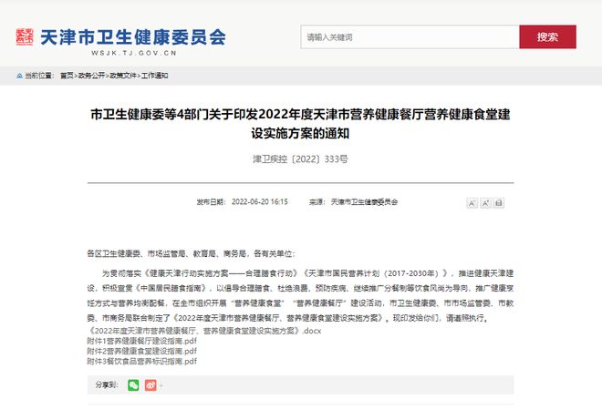 近日,天津市卫生健康委等4部门印发了《2022年度天津市营养健康餐厅营养健康食堂建设实施方案》。该方案明确:年内各区将建设不少于5家营养健康餐厅、不少于10家营养健康食堂。