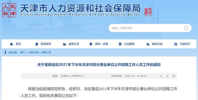 日前,天津市人力资源和社会保障局网站发布通知,经研究,决定重启2021年下半年天津市部分事业单位公开招聘工作人员工作。