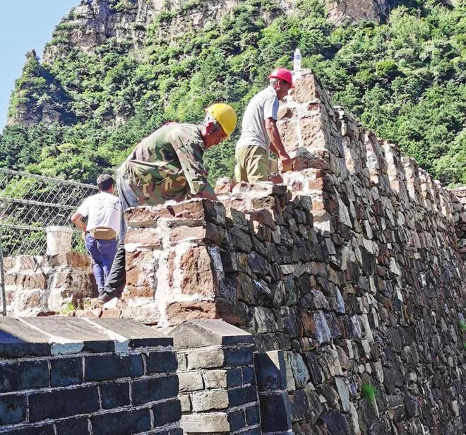 眼下正值高温酷暑季节,但在蓟北山区黄崖关长城景区,修缮受损墙体施工一天也没耽误,30多名施工人员按照要求,精心进行墙体维修加固作业,让黄崖关长城矗立在崇山峻岭之巅。