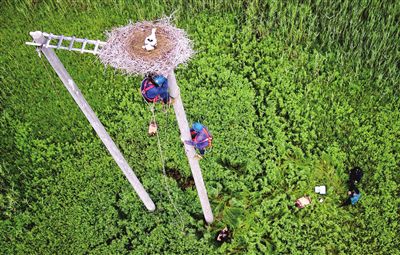 7月26日上午,天津规划和自然资源局协同天津师范大学、北大港湿地保护区和国网滨海电力等部门工作人员,为今年在北大港湿地筑巢度夏的数窝东方白鹳雏鸟安装GPS定位系统,实时监测雏鸟的生长状况及未来的迁徙路线,为保护东方白鹳提供科学、详实的数据依据。同时,这也是我国首次成功为非自然繁殖的东方白鹳雏鸟安装GPS定位系统。当日下午3时左右,科研人员顺利接收到第一批从雏鸟身上传出的GPS数据。(记者 钱进 潘立峰 摄影报道)