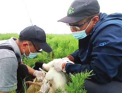 天津师范大学教授赵大鹏(左)和天津野生动物驯养繁殖中心工作人员刘洋(右)为东方白鹳雏鸟加装GPS定位系统。
