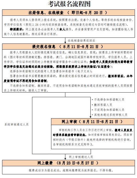 1. 提交报名信息时间为2023年8月11日至8月21日。注册信息原则上24小时内返回核查结果,建议报考人员提前完成用户注册及学历、学位信息补充,以免错过报名。为加强报名证明事项告知承诺制事中监管,自今年报名起,如报考人员提交的境内高等教育学历学位信息无法通过在线自动核验,应在报名前及时登录中国高等教育学生信息网(学信网)进行验证/认证,下载相关PDF格式在线验证/认证报告,报名期间按要求上传相关验证/认证报告,接受人工核查,具体操作方式参见中国人事考试网“考生问答”栏目内容。