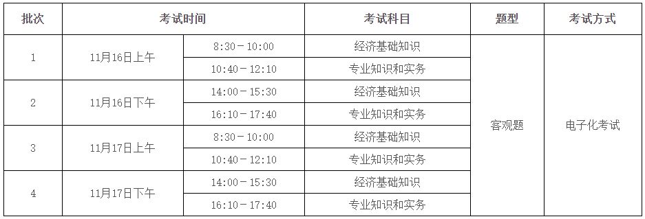 注:各级别及专业类别的具体批次和考试时间以准考证为准。对于同时报考公共科目和专业科目的考生,两科目考试在同一批次内分2个场次连续组织,间隔时间为40分钟。