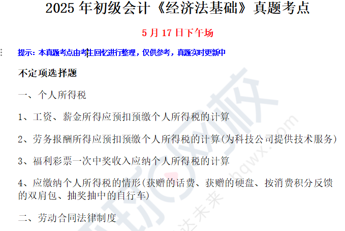 2025年初级会计师考试5月17日两场次结束,根据考生回忆整理了初级会计经济法真题考点下午场,速来了解!