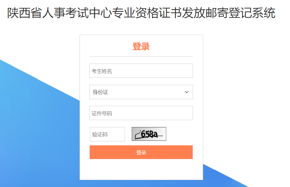 2.操作流程:请考生登录陕西人事考试网→证书发放→点击陕西人事考试中心证书邮寄系统→填写姓名、身份证号码及网页登录验证码→进入系统按提示操作。操作完成后,将根据考生填写的相关信息,将证书和《陕西省专业技术资格考试合格人员登记表》(邮寄系统自动生成)一并邮寄。