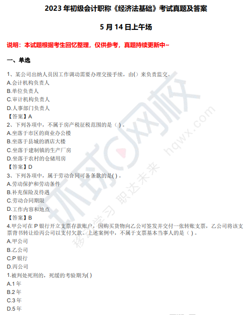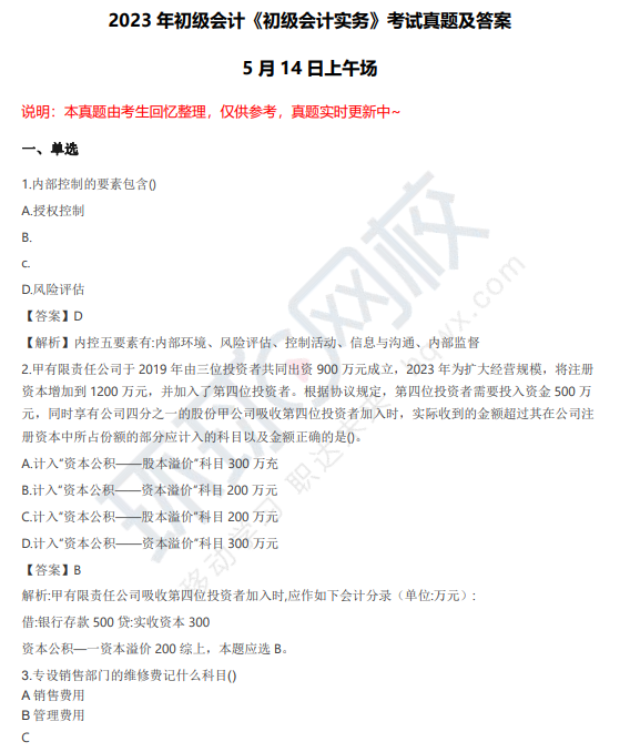 2023年5月14日上午场初级会计真题由考生回忆整理,仅供参考,真题持续更新中!