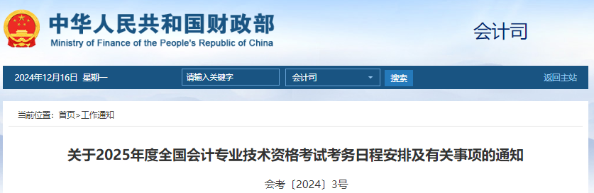 财政部发布2025年度全国初级会计考试报名通知,报名时间为1月3日至1月24日