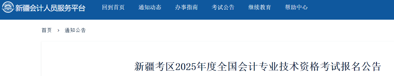 12月22日,新疆会计人员服务平台发布了《新疆考区2025年度全国会计专业技术资格考试报名公告》,明确2025年新疆初级会计报名时间为1月6日至1月24日12:00,缴费时间为1月6日至1月24日18:00,考试时间为5月17日至20日,实行网上报名,报名网址为:全国会计人员统一服务管理平台。