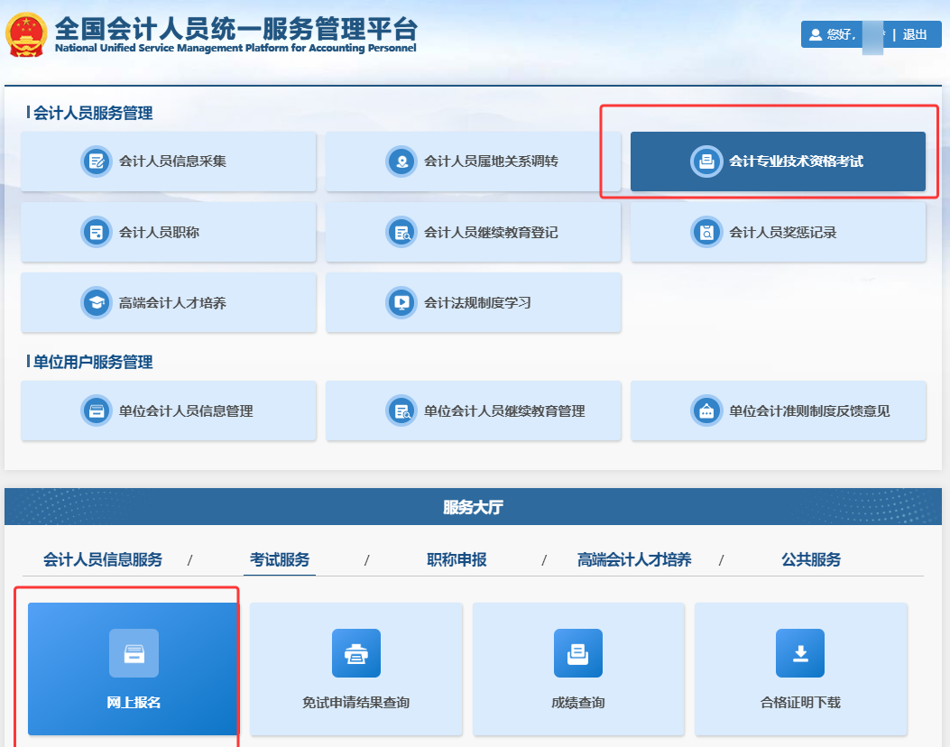 1.登录“全国会计人员统一服务管理平台”(https://ausm.mof.gov.cn)进行注册并完成实名认证后,报名期间内进入“会计专业技术资格考试”模块报名。