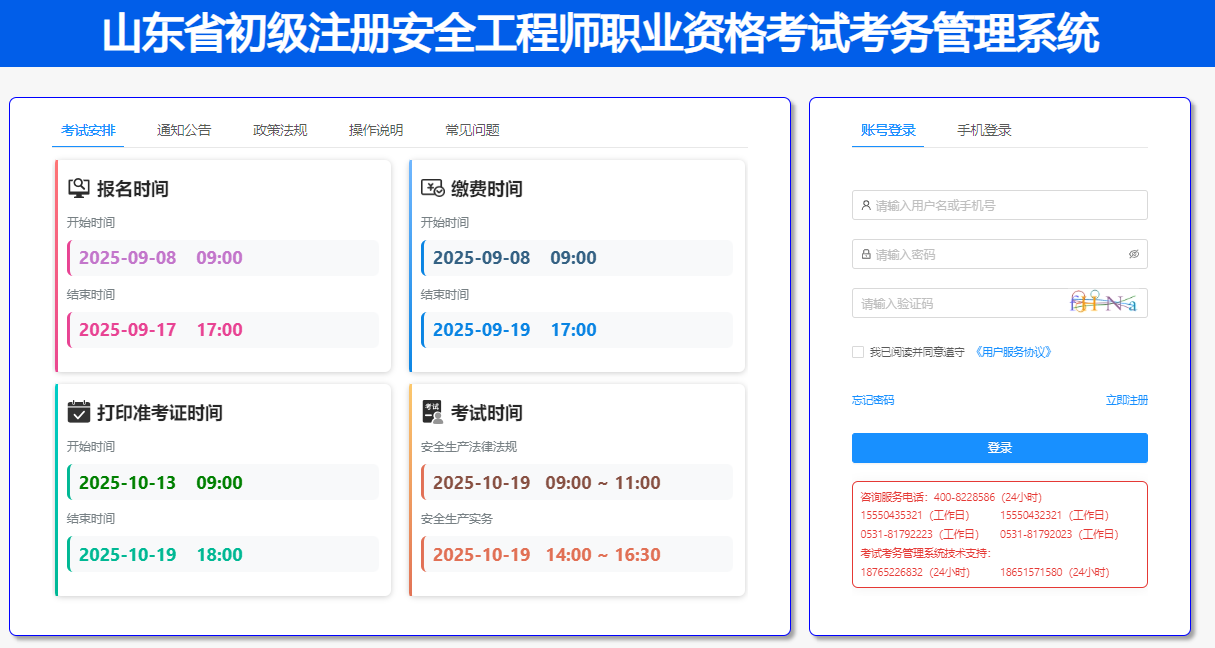 请应试人员登录山东省初级注册安全工程师职业资格考试考务管理系统(http://119.148.160.250:9001,以下简称考试考务管理系统),输入个人账号、密码、验证码,点击“登录”进入该系统,点击导航栏“我的考试”,查询考试成绩。技术咨询电话:18765226832,15550435321。