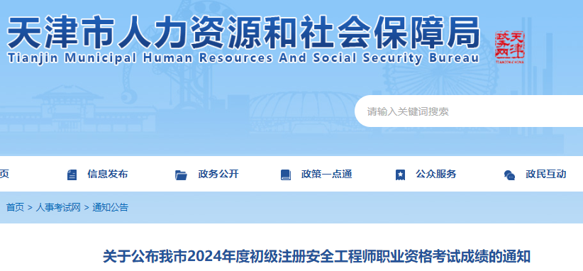 10月28日,天津市人力资源和社会保障局发布了《关于公布我市2024年度初级注册安全工程师职业资格考试成绩的通知》,其中明确2024年天津初级注册安全工程师成绩已公布,请考生登录天津市人力资源和社会保障局网站“天津人事考试”版块页面左侧“天津市专业技术人员资格考试”栏目进行查询。