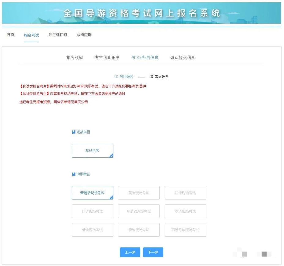 第七步:上传资料后点击“我同意”按钮,进入科目选择页面,根据自己的情况选择科目和考试语种。初试类考生需同时报考笔试机考和现场考试,加试类考生仅需报考现场考试。