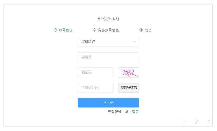 第四步:考生使用手机号码或电子邮箱进行注册,填完信息后,点击“下一步”按钮,显示“注册完成”;如果考生之前注册过可直接登录。