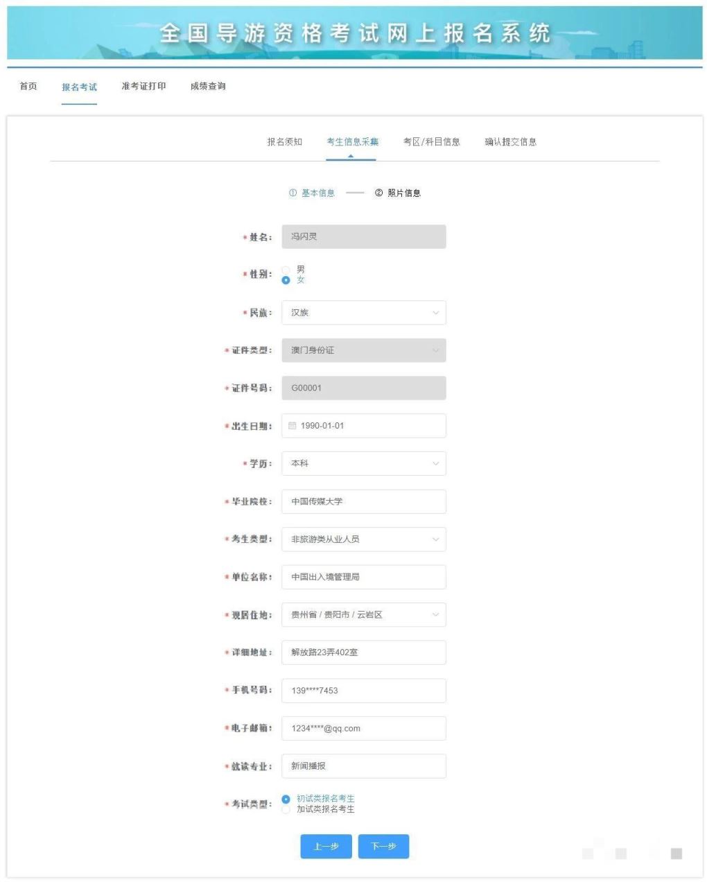 第六步:进入考生信息采集页面,考生按照要求完善基本信息和照片信息,上传照片包括免冠证件照、学历证明、身份证正反面以及其他各省市要求的资料。每类上传资料的格式要求均有提示,考生按照要求上传即可。